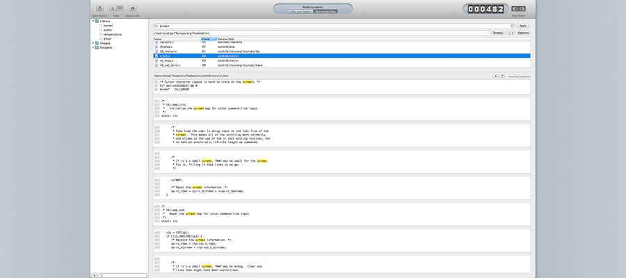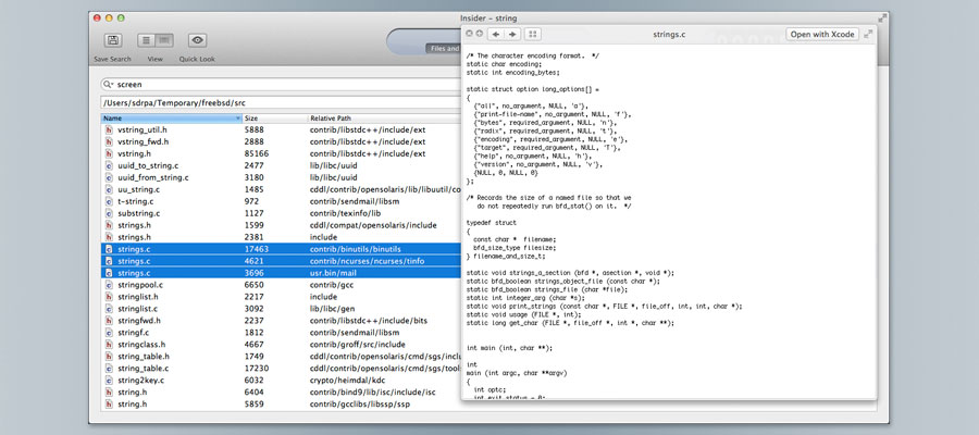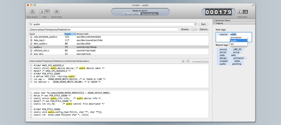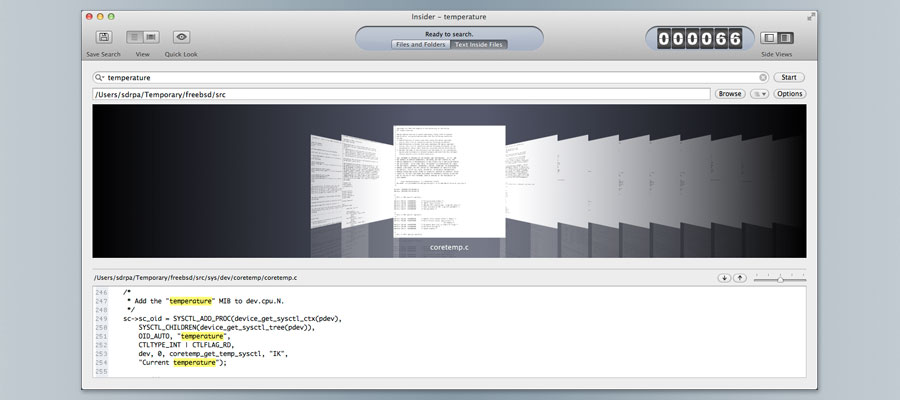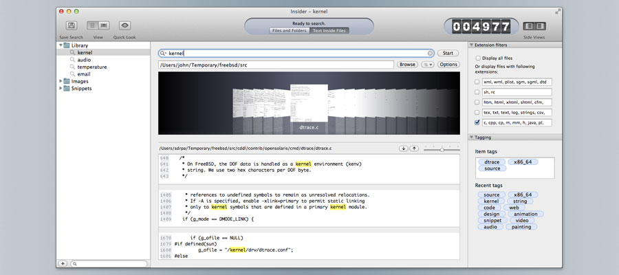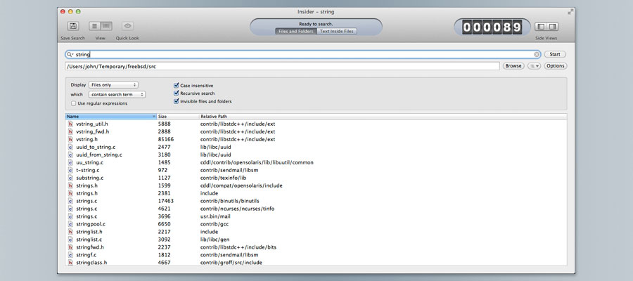 Insider helps you to find files and folders or specific text within them, combining Spotlight with Unix Find and Grep search tools. It will search any set of directories that match your search criteria. The search is recursive including all subdirectories.