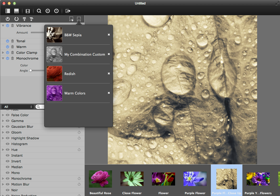 The combinations can be saved as presets for later use. A preset can be applied to a selection of images at once. -