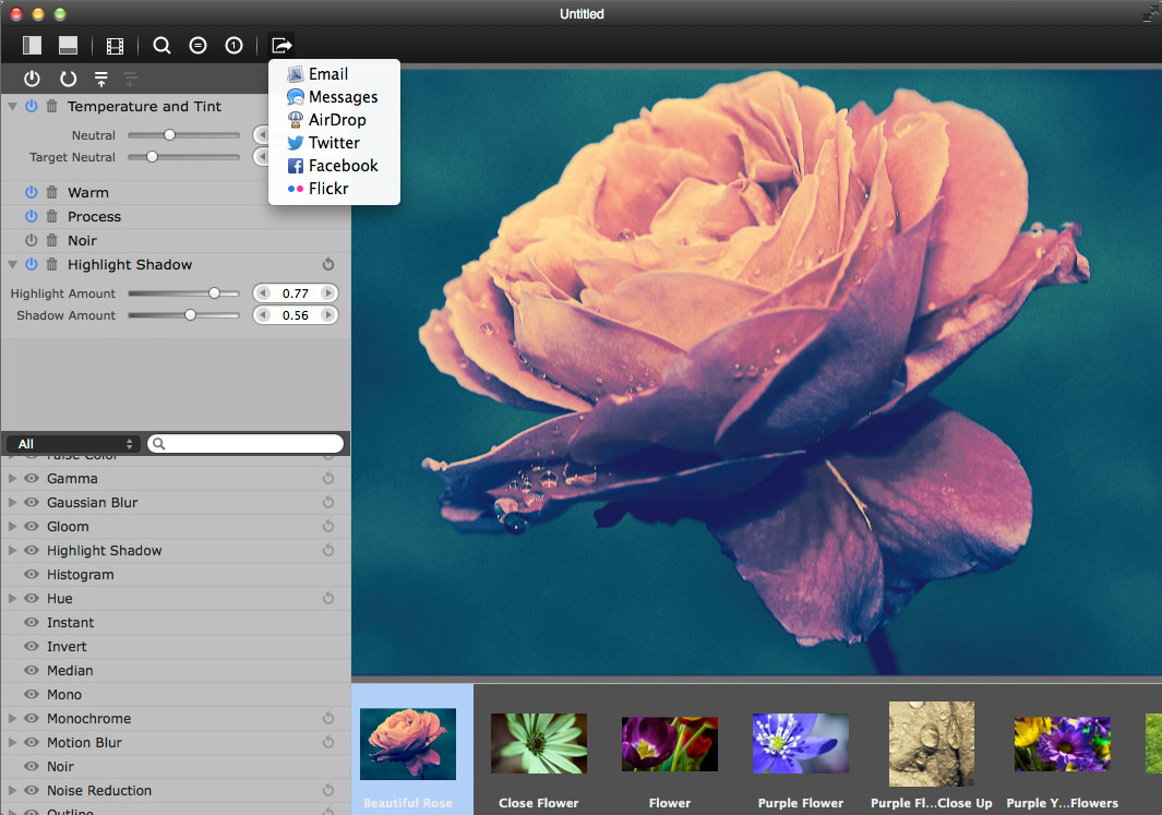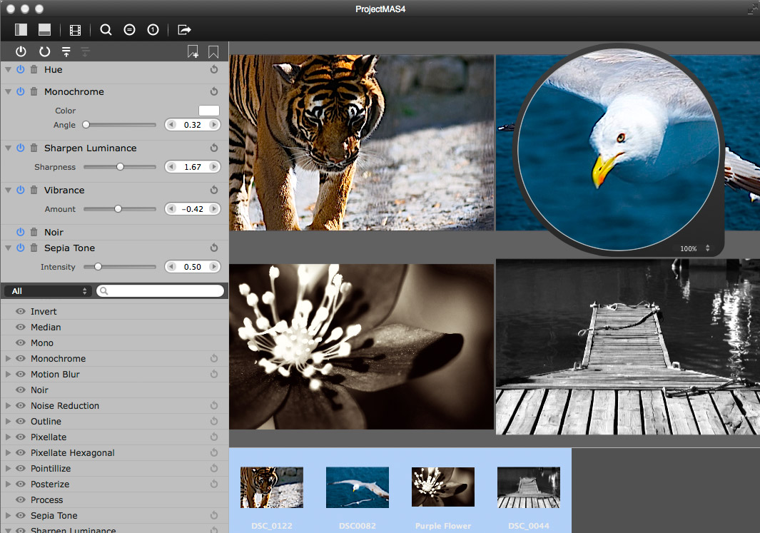 The combinations can be saved as presets for later use. A preset can be applied to a selection of images at once. -